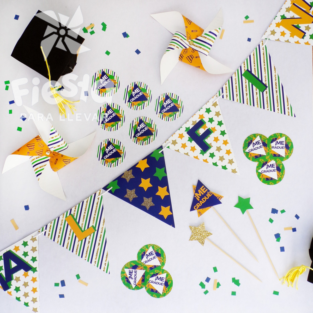 Incluye rehiletes, topper de estrellas y triángulos, banderín de 6 piezas con la frase ¡Al fin! y hoja con 12 tarjetitas multiuso para decorar popotes, servilletas, bolsitas, vasos, calcomanías, etc. Con la frase "Me gradué" así que sirve para graduaciones desde preescolar hasta la universidad.