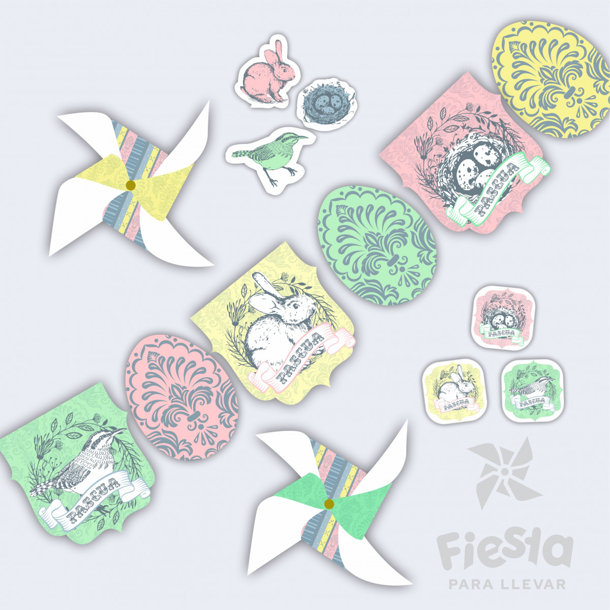 Incluye 2 figuras para pegar en la pared o como centro de mesa, una de huevo y otra de conejo, topper de 3 piezas (pajarito, nido y conejo) para decorar el pastel, banderín de 6 piezas diferentes y hoja con 12 tarjetitas multiuso para decorar popotes, servilletas, bolsitas, vasos, calcomanías, etc.